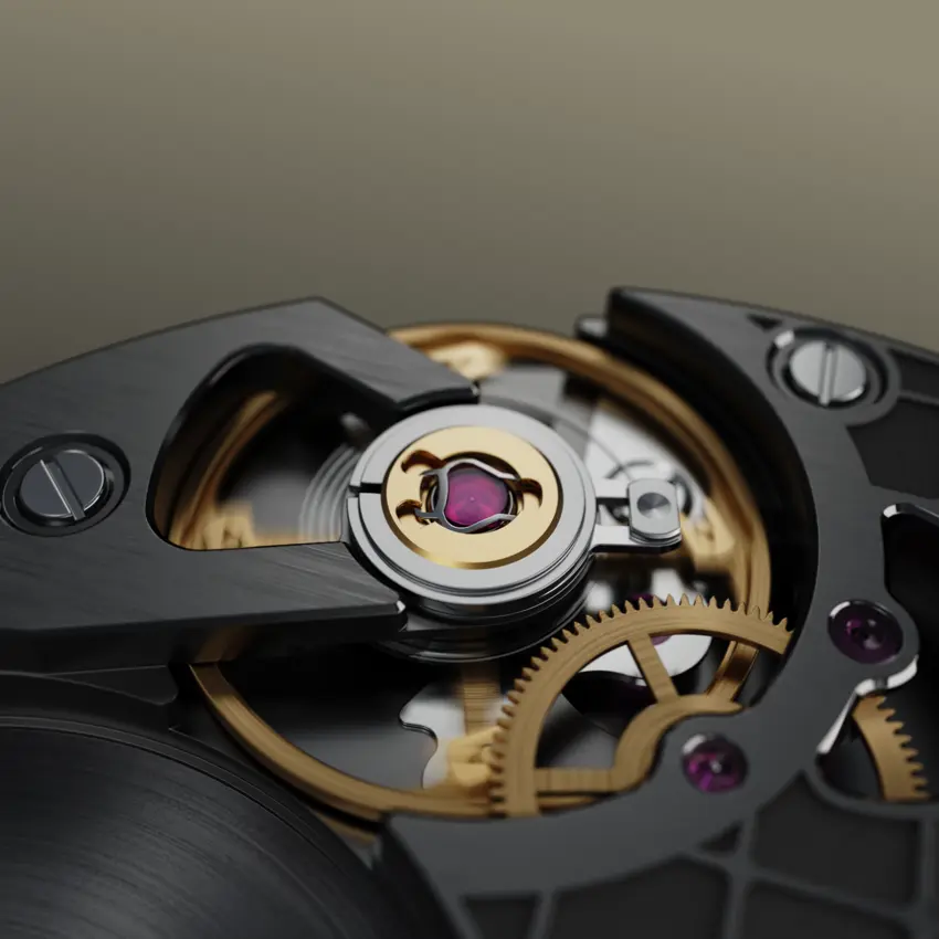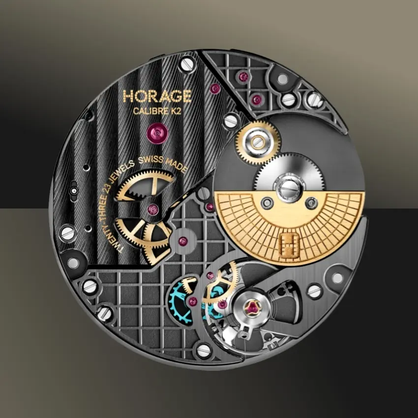 作為一款介於手工精緻和工業化量產之間的高性能機芯,K2的獨特裝飾令人印象深刻,黑金電鍍加上金色字樣,主夾板上飾有日内瓦波紋,Anglage倒角及半透視切口,標誌性的格網圖案元素設計,其靈感源自HORAGE品牌商標; 包含像是日內瓦波紋,拉絲處理,倒角等裝飾,這些全都是由手工所完成的。在微型自動盤方面,則是使用鎢鋼搭配金色電鍍,加上雷射雕刻仿造出磁磚風貌,來呼應HORAGE品牌商標,同時,表面也運用手工拉絲和抛光面來處理。除了鎢鋼,根據不同專案項目,我們也還在探索運用其他貴金屬的可能性。而機芯上鑲有23顆寶石,與黑色背景形成鮮明對比,創造出一種未來主義的氛圍。